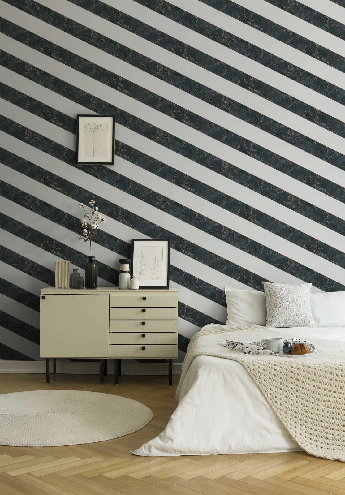Wieder einmal sind wir von den Tapeten aus der Kollektion “Change is Good” von Michael Michalskys absolut überzeugt. Seine fünfte Tapeten-Kollektion unter dem Titel Metropolis ist eine Zusammenstellung aus stylischen und modernen Mustern und Designs. Die Tapete 37992-3 mit Marmor-Muster und Streifen in schwarz, weiß, gold und mit Glanz-Effekten sorgt für ein angenehmes Wohngefühl und lädt zum Verweilen ein.