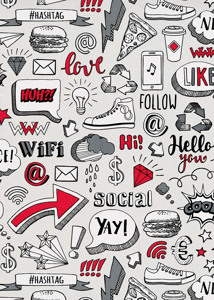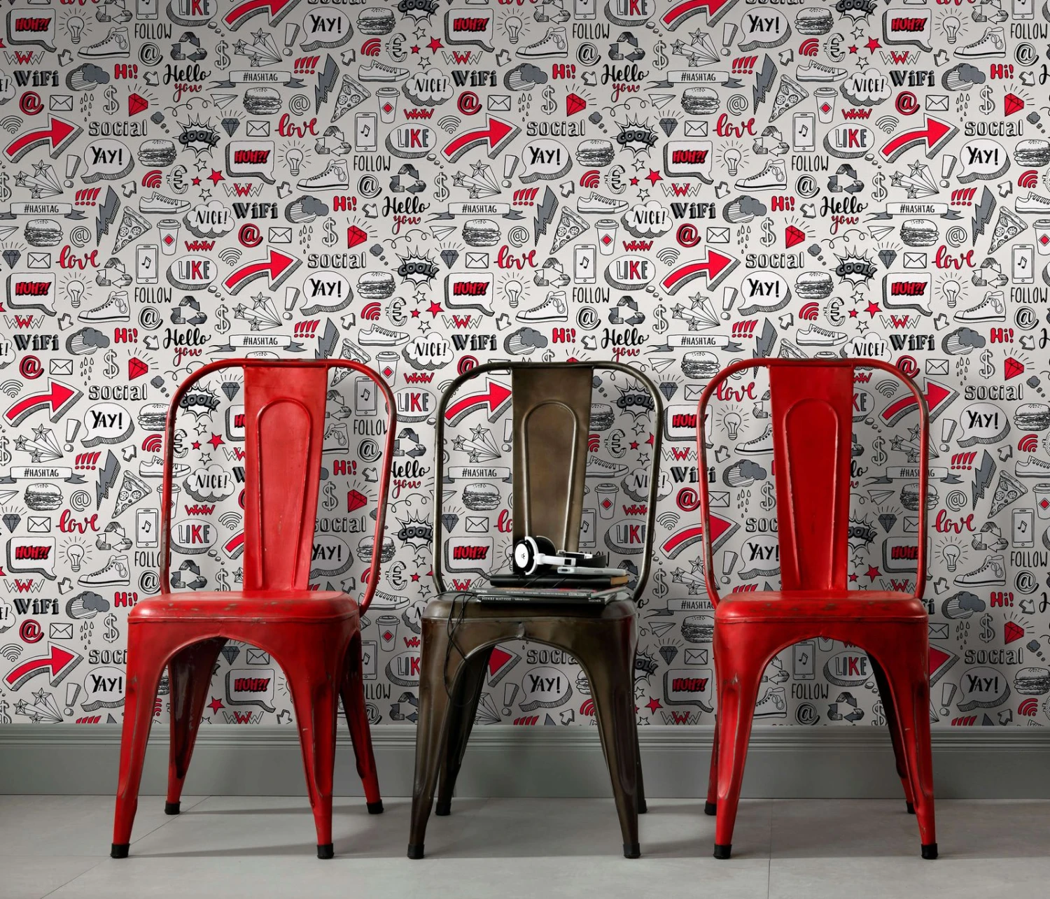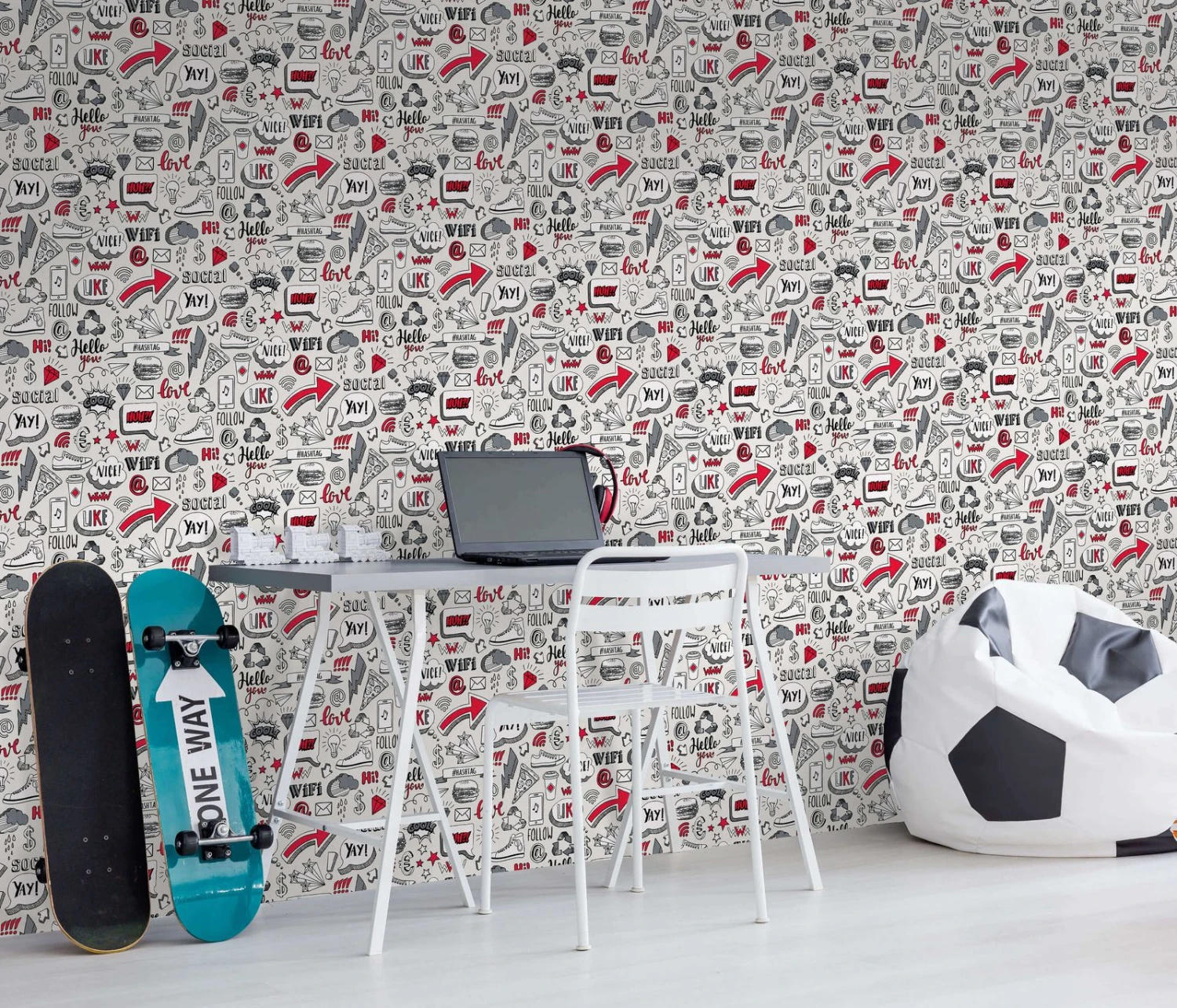Entdecken Sie die Kindertapeten der Kollektion „Sweet and Cool“ von Erismann. Fröhliche Farben und coole Motive lassen Einrichtungsträume von klein und groß wahr werden. So bezaubern Motive wie Feuerwehr- und Polizeiautos, süße Alpakas oder coole Skateboarder die Wände jedes Kinderzimmers und lassen Raum für Fantasie. Darüber hinaus überzeugen die Tapeten mit guten Materialeigenschaften. So sind sie sehr wischbeständig und lassen sich trocken abziehen. Die Tapete 10163-10 zeigt ein Muster mit Comic-Motiven in Grau- und Rottönen.