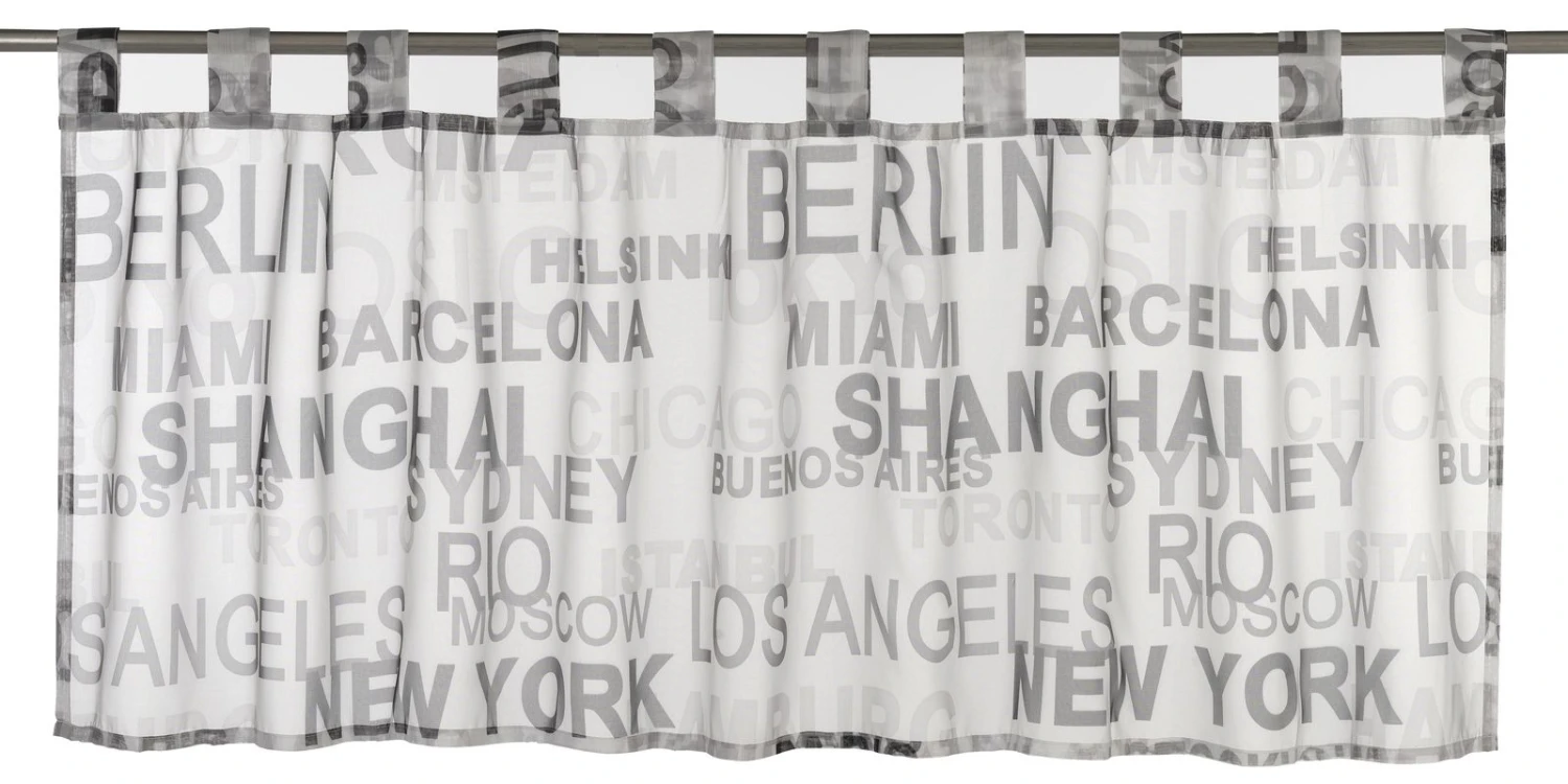 Mit der transparenten Scheibengardine 198800 von Elbersdrucke aus der Serie “City” werten Sie Ihren Fensterbereich in der Küche stilvoll auf. Der Vorhang hat ein Stoffmaß von ca. 48 x 140 cm (LxB) und ist zu 100% aus Polyester gefertigt. Das Produkt kann bei 30°C im Schonwaschgang schnell und einfach gereinigt werden. Die Bistrogardine begeistert mit trendigen, aufgedruckten Städtenamen. Zusätzlich bietet Ihnen dieses pflegeleichte Panneau, mit praktischer Schlaufen-Aufhängung, einen leichten Sichtschutz: Der untere Teil des Fensters wird verdeckt und hält neugierige Blicke fern, Sie können aber trotzdem den Ausblick genießen.
