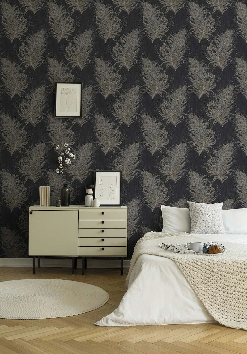 Die luxuriösen Vliestapeten aus der Kollektion Mata Hari von livingwalls bringen dein Zuhause zum Strahlen. Elegante Designs im barocken Stil passen nicht nur in ein klassisch gehaltenes Wohnzimmer sondern auch in ein gemütliches Haus im Landhaus-Style. Die Tapete 38009-4 mit Federn in anthrazit, grau, gold wertet mit ihren Glanz-Akzenten deinen Wohnraum auf und lädt zum Verweilen ein.
