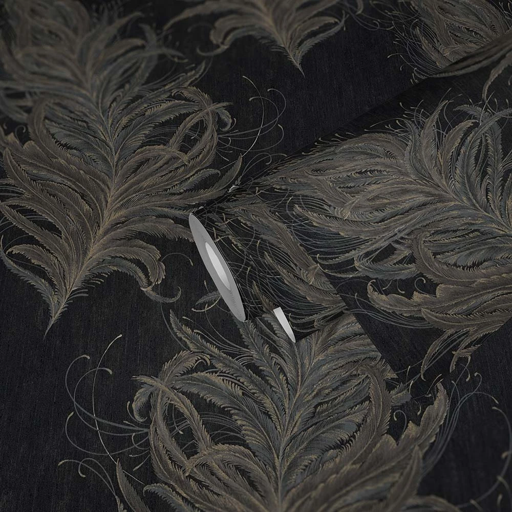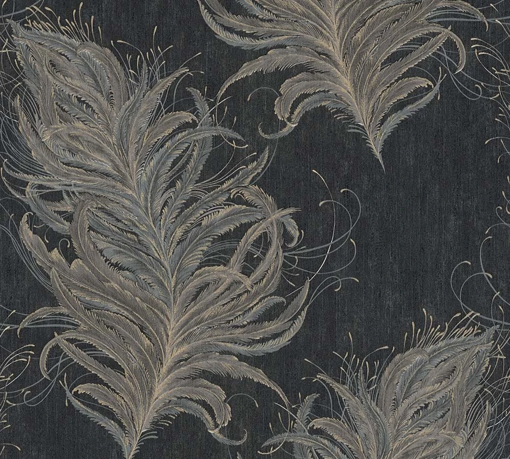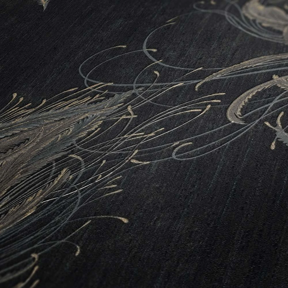 Vliestapete Federn Natur anthrazit grau gold Mata Hari Livingwalls 38009-4 | 380094
